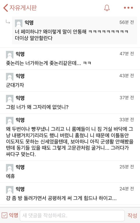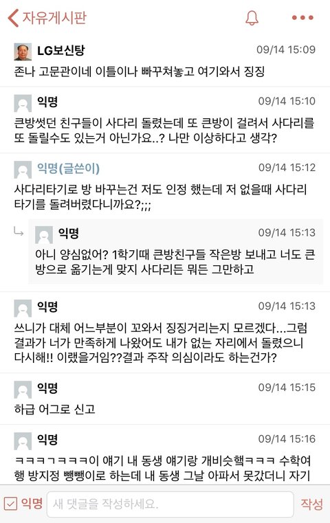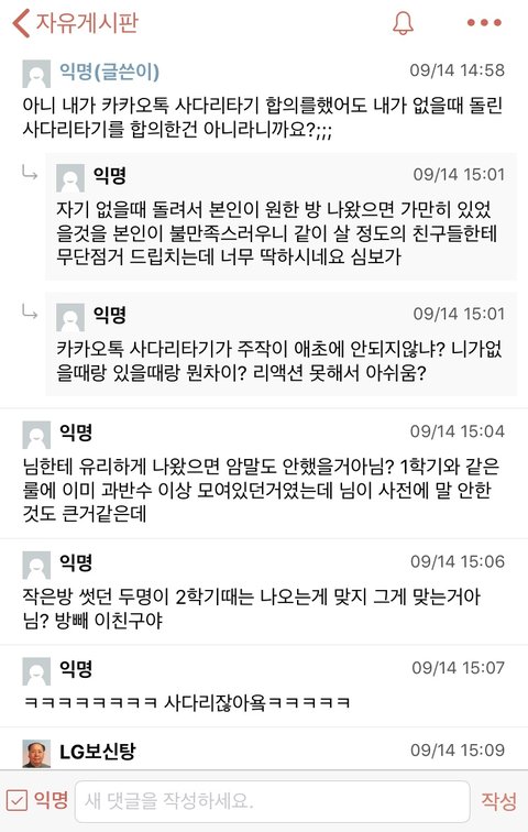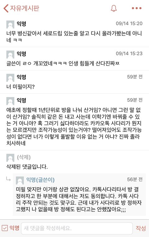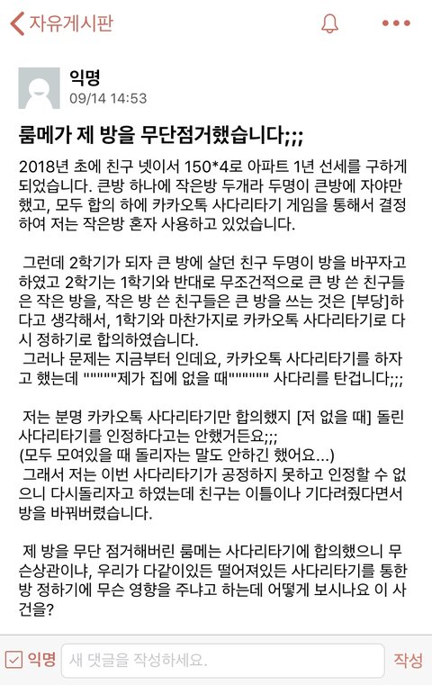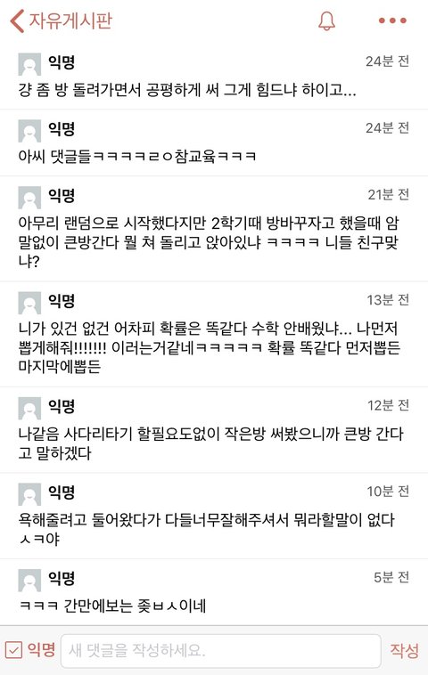 + 자기도 사다리타기로 다시 방을 바꾸는 것을 합의하였고, 사다리게임에서 어떠한 조작도 불가능 함을 시인했으나, 단순 자신의 신체가 다른 룸메들(3명인데 다 따로 있었음)이랑 함께하지 않았다고 저렇게 억지를 부리네요