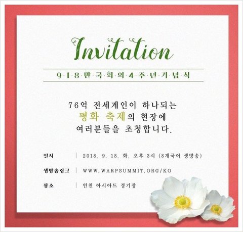 주관: HWPL (하늘문화세계평화광복)일시: 2018년 9월 18일 화요일 오후 3시장소: 인천 아시아드 경기장