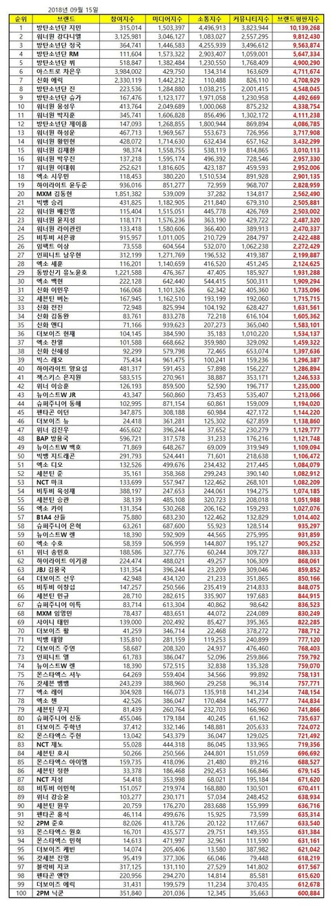 남자 아이돌 브랜드평판 9월 개인순위