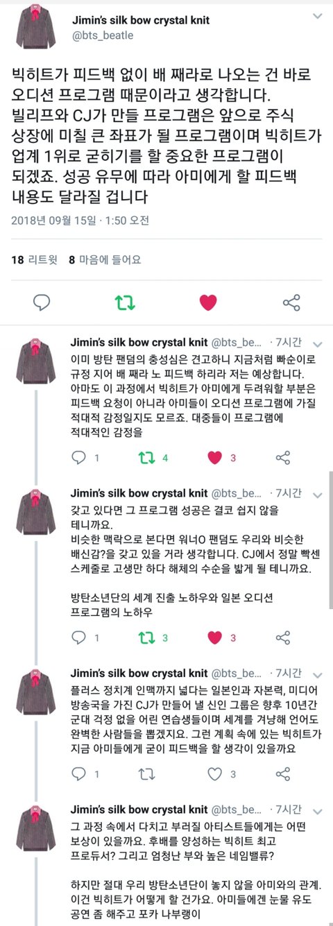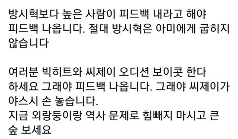 일리있는 말이야 빅힛은 지금 방탄이 먼저가 아니고 회사가 우선이니까 지금 빅힛이 제일 두려워 하는건 전세계 아미들 연합해서 오디션 보이콧 하는거니까 이걸 노려야 한다고 봐