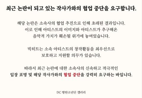 공카에서 ㅂㅁ 주장하면서 반대되는 의견에는 역정 내거나 무시하는 분위기인 것 같은데, 이거 치우자. 듣지 않아도, 욕을 해도 계속 쓰자. 거긴 애들도 있는 곳이고, 어떻게 해야할지 모르겠는 아미들도 있을 것이고, 외랑둥이들도 있어. 그러니까 그에 반하는 생각도 있다는 걸 알려줘야 해.