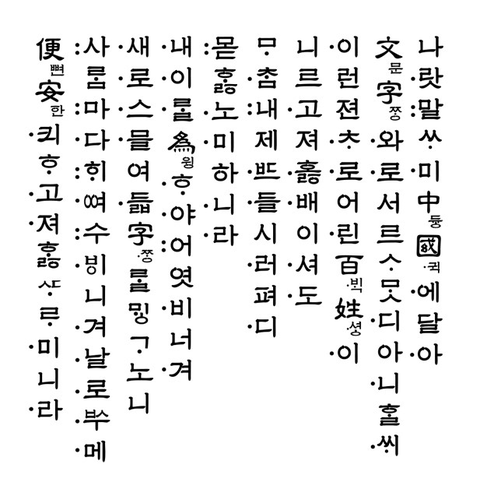 나랏말싸미 듕귁에달아 문자와로 서르 사마디 아니할쌔