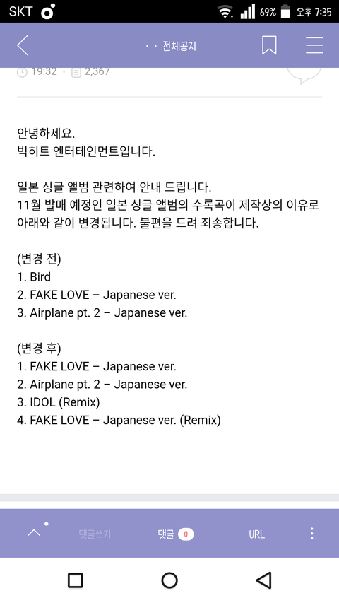 그러나 이제는 빅히트에서 반응을 보인 상태니까 너무 과한 공격이나 요구는 멈추는게 좋을듯해.어찌됐건 내 가수 회사야. 쉴드치자는게 아니라 비록 무녀졌더라도 6년동안 쌓아온 신뢰가 있으니 조금만 더 기다려주자. 그리고 이번 일로 마음 흔들린 아미들 우리는 방시혁이나 빅히트를 좋아한게 아니라 방탄소년단을 좋아하고 응원해왔던거잖아? 멤버들은 여전해. 그러니까 우리들도 여전해야지. 다들 많이 힘든 3일이었겠지만 반쪽짜리더라도 피드백이 뜬 만큼 이제 마음 다잡고 각자 할일 하는거야. 우리 K-Diamond잖아ㅎㅎ 이번 일로 더 단단해질 수 있을거야. 알겠지?? 다들 보라해