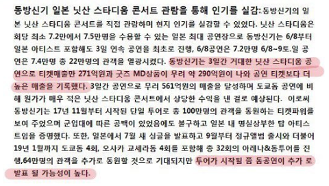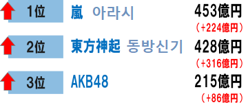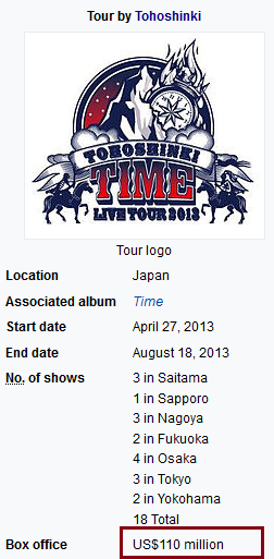 일본 일본 전국투어(원천: 네이버, wikipedia) 1233억원 아시아-월드 투어,공연횟수 8회 ~360억원일본 앨범,신글앨범, DVD 판매량(원천:오리콘) ~416억원팬미팅 ~49억원