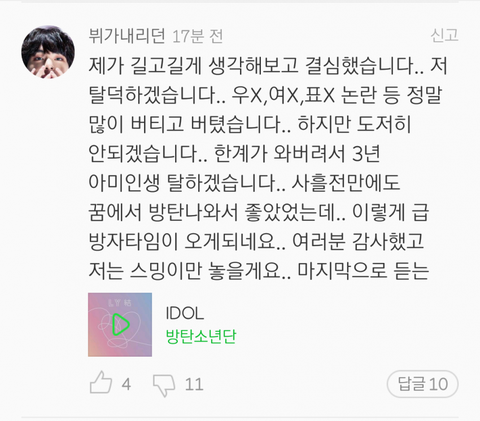 여기서 불매 왜 안 하냐하는 애들도 거의 다 타괜이라고 보면 됌 방탄이 망하면 지들이 이득이거든 ㅉㅃ ㅇㅅ 아미들은 제발 정신 좀 차려라 제발 좀
