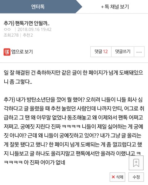 댓글을 보니까 내가 방탄소년단 안티이고 어그로짓을 했다는 식으로 얘기를 하더라?