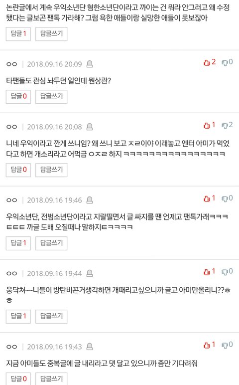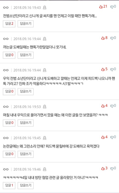 갑자기 나보고 '닥쳐'라며 욕을 하는 사람도 있었고, 내가 방탄을 되게 싫어한다는 식으로 얘기하는 애들이 많더라고? 맨 밑 댓글(중복글 지워달라고 하는 중이야 라는 댓글)만 빼고.
