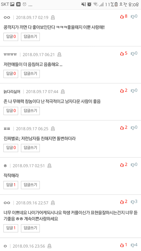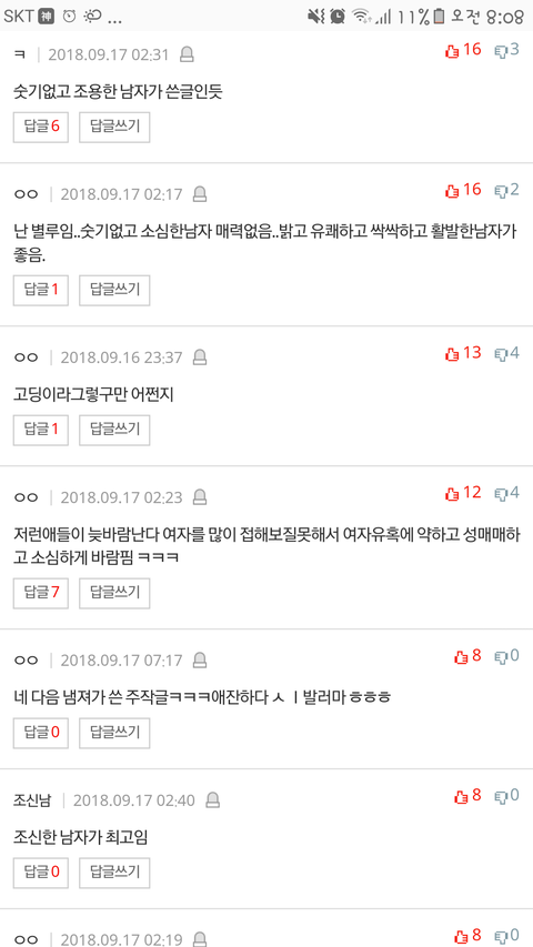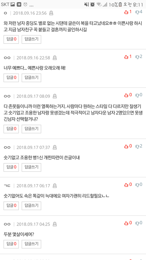 그냥 순수한의도로 올린글에 다 저렇게 모욕적이고 기분나쁜 댓글들이 달려서 진짜 상처받고 우울해졌어