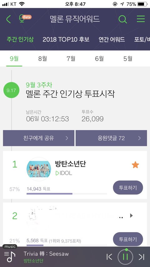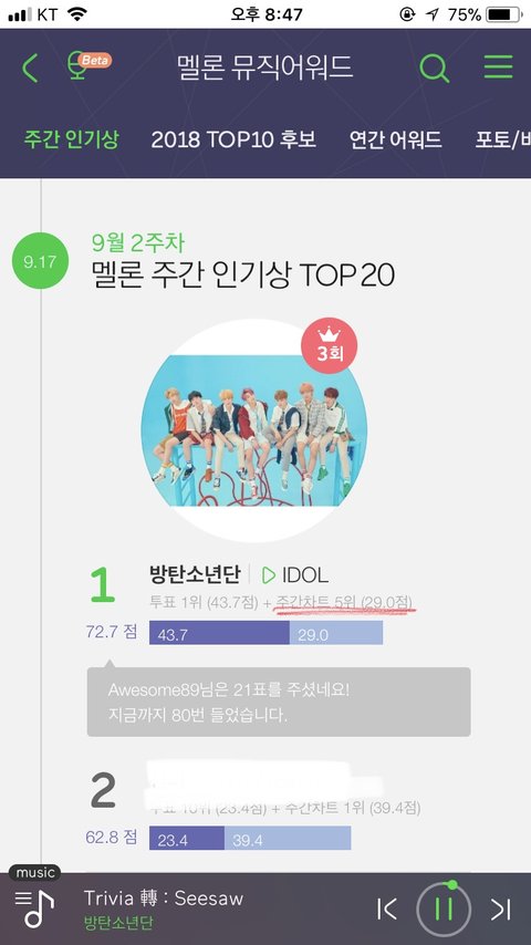 지난주도 인기상타긴했는데 음1원이 많이 밀렸어ㅠㅠ