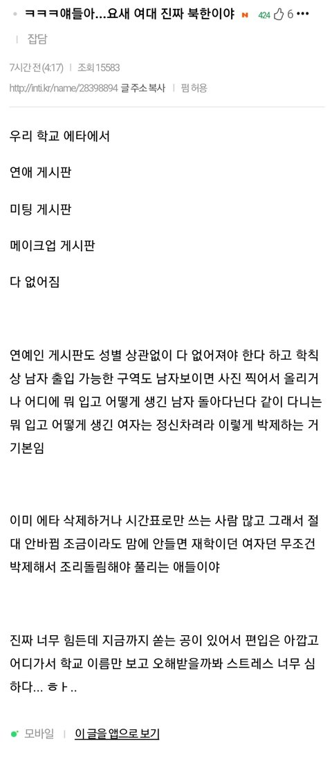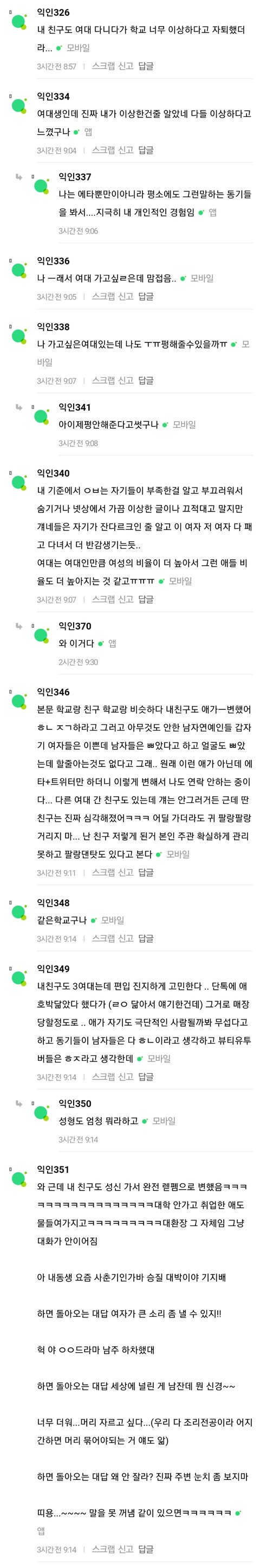 주변 친구들한테 물어보니 여대 페미소굴이잖아~ 이런 소리하더라. 우스겟 소리로 넘겼었는데 나만 그런게 아닌가봐. 아니나 다를까 이게 여대 현실이래.