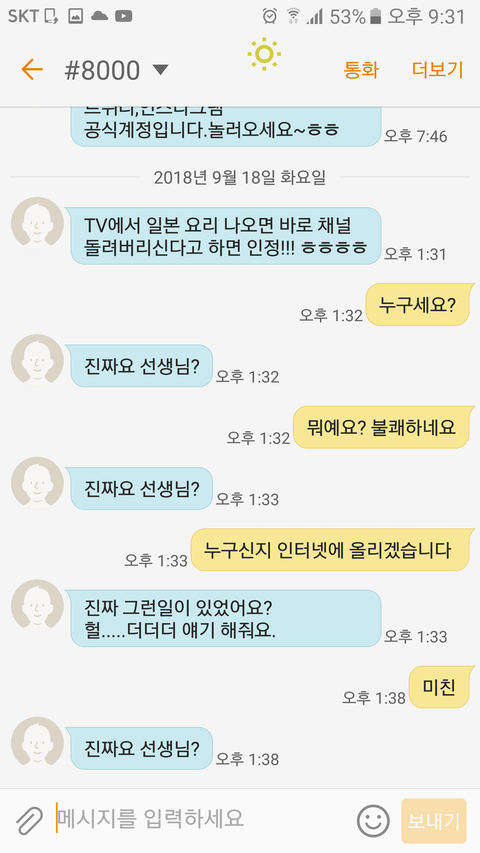 오늘 갑자기 #8000번으로 문자가 왔어요.