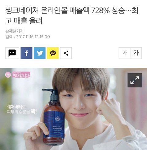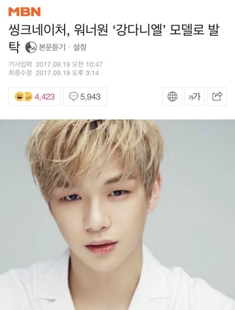 2017년 9월 19일 강다니엘 씽크네이처 모델로 발탁됐다는 기사 두둥!