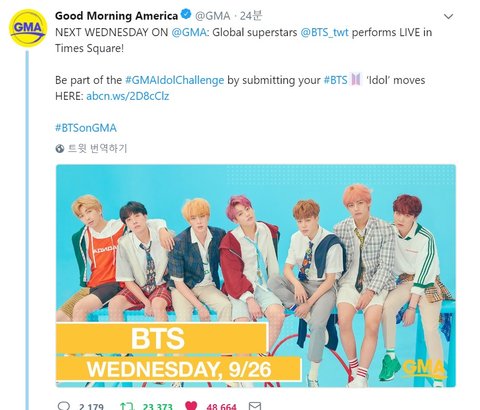 나 미국 사는데 GMA는... 그 아침에 일어나자마자 그냥 아무 생각없이 가장 먼저 티비 틀잖아. 그 때 무조건 트는게 GMA야. 뭐 이유도 없음 그냥 무조건 봄. 여기에 나간다는 거 진짜 대박임