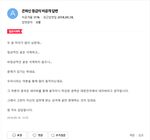 정상적인글 막 계속지운다고 네이버 에 계속질문올리니깐.. 귀찬았는지 복구해준글이거든여?