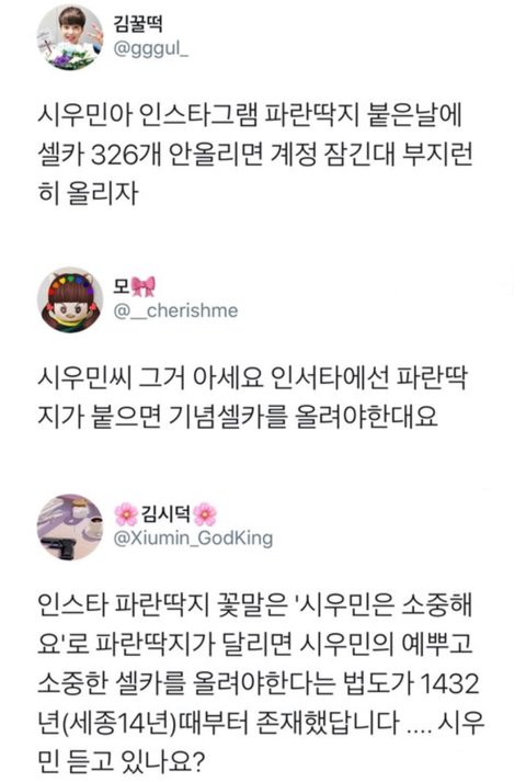 시우민씨!! 인스타 파란딱지가 붙은 다음 셀카를 326장 올리지 않으면 인스타법 위반으로 계정이 잠긴대요ㅠㅠㅠ