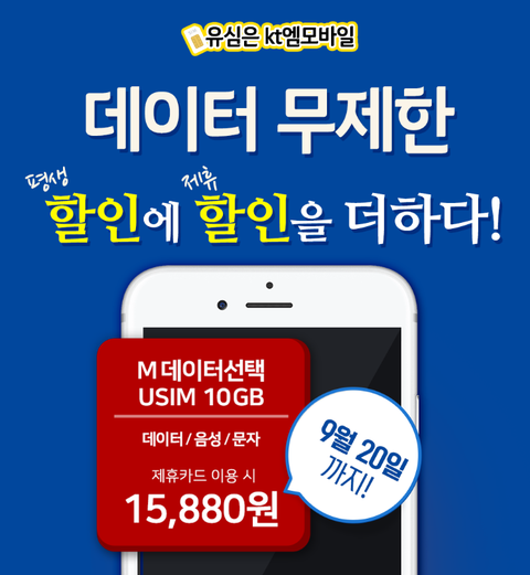 kt엠모바일 에서 9월 20일까지 M 데이터선택 USIM 10GB 라는 알뜰폰 요금제 이벤트를 한다고 해요 월 만원대에 요금제로 저렴하게 사용 할수 있다고 하네요