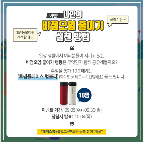 9월 5일~9월30일까지 일상생활에서 지키고 있는 비점오염원 줄이기 행동을 댓글로 공유하면 추첨을 통해 10명에게 투썸 플레스 텀블러를 랜덤 배송을 해준다고해요비점옹며원줄이기 행동이란 애완동물이랑 산책 할 땐 대변봉투 챙기기 , 쓰레기는 쓰레기통에만 버리기 등등 자연을 지키는 행동을 말해요