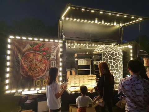 수많은 인파속에 저녁요기 시간이 되어 초딩 아이둘과 수많은푸드트럭속에서 메뉴를 고르는중 나는 퓨전 볶음밥 같은게 땡겼는데 아이들이 피자를 먹고싶다고 졸라서 1만원짜리 피자트럭 앞에 줄서서 기다려 피자사옴.