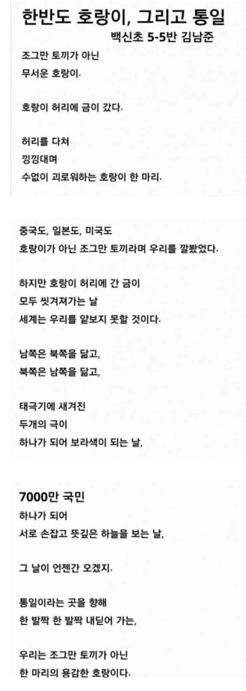 현 남북 이슈 관련된 기사인데 기사 도입에 백신초 5-5 김남준 어린이 시 인용됨 ㅋㅋ