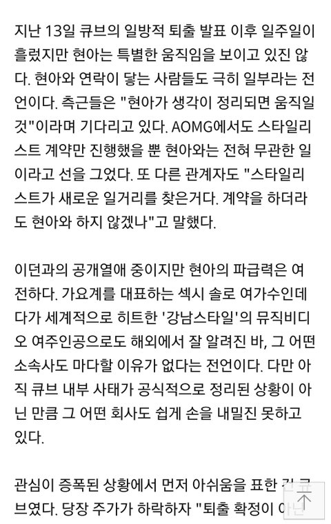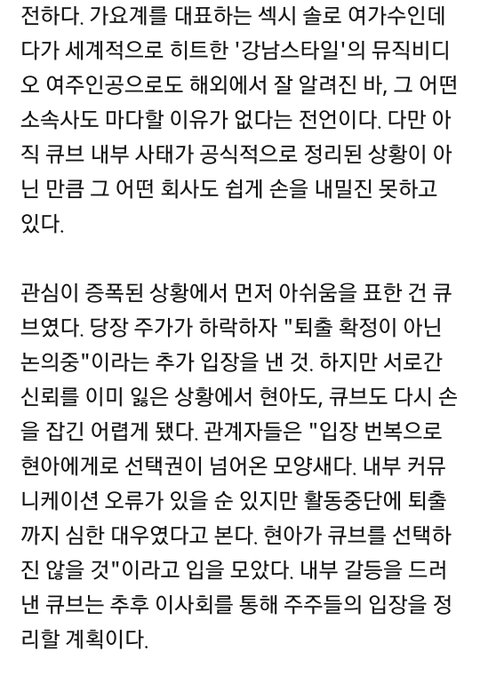 경영진들이 현아이던 퇴출계속 밀어붙였으면 큐브 주주들 전부 들고일어나서 대리인 내세워 주식신탁맡기고 임시주총 열어서 경영진들 다 내보낼 생각이었다던데 ㅋㅋㅋㅋㅋㅋ독단적인건 경영진도 마찬가지;;