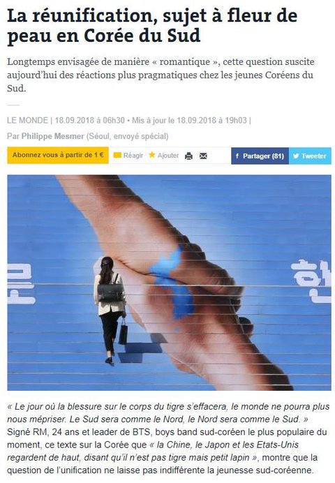 "호랑이 허리에 간 금이 모두 씻겨져가는 날, 세계는 우리를 우리를 얕보지 못할 것이다. 남쪽은 북쪽을 닮고, 북쪽은 남쪽을 닮을 것이다." RM (24) (현재 가장 인기있는 한국의 보이밴드인 BTS의 리더)의 시에 의하면 한국은 "중국, 일본과 미국이 낮잡아 보고, 호랑이가 아닌 조그만 토끼라고 말한다", 이는 통일 문제가 남한 청소년에게 무관심하지 않는다는 것을 보여준다. (생략)