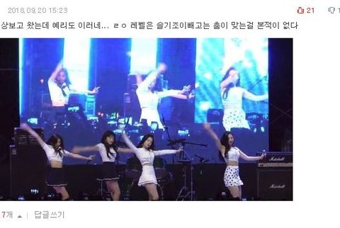 방금 예리 안무글 본사람? 조이 슬기는 다 잘맞고 잘한다고 예리 아이린만 틀린다는 글 봤어?