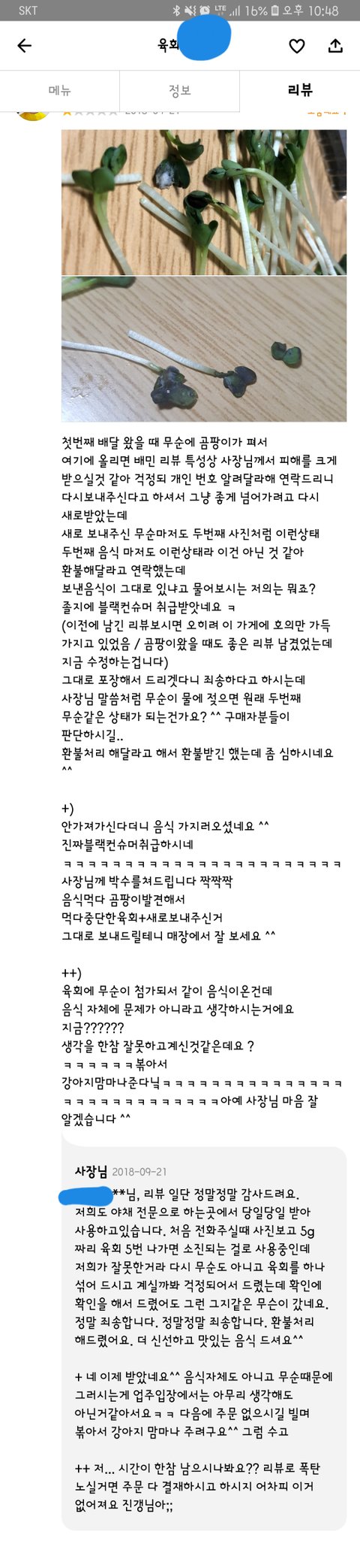 곰팡이핀무순이낀 육회를 누가먹습니까 ㅜㅜㅜ (무순이 다른 통에 담겨있는것도 아니고 육회와 같은 통에 함께 세팅되어있는데 말이죠 ㅜ)