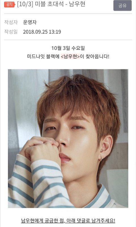 성종이 라디오 공식 홈게시판에 올라온 약 20분전 따끈따끈한 소식이야 10월 3일에 우현이 출연 한다는 소식이 그날 보이는 라디오 였음 좋겠다....