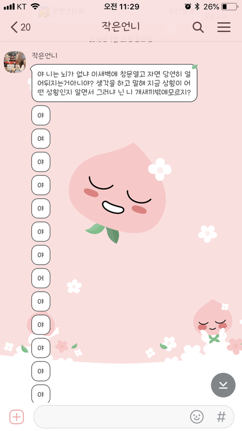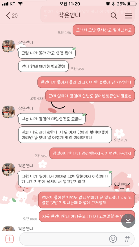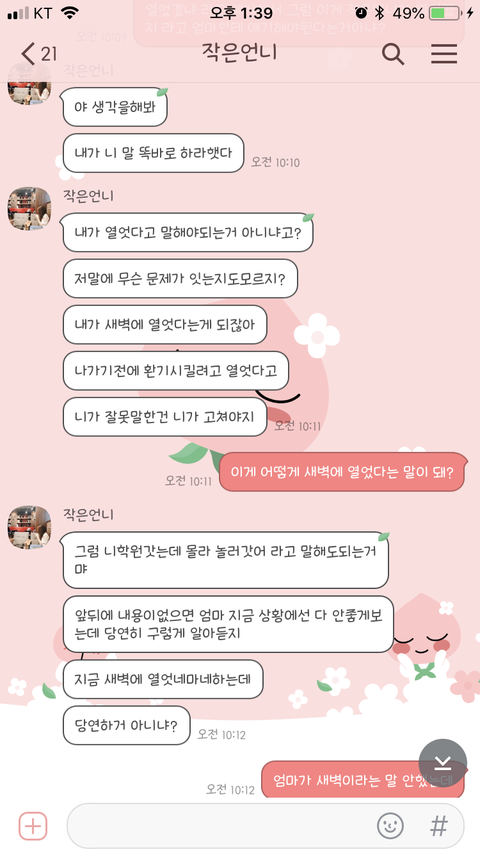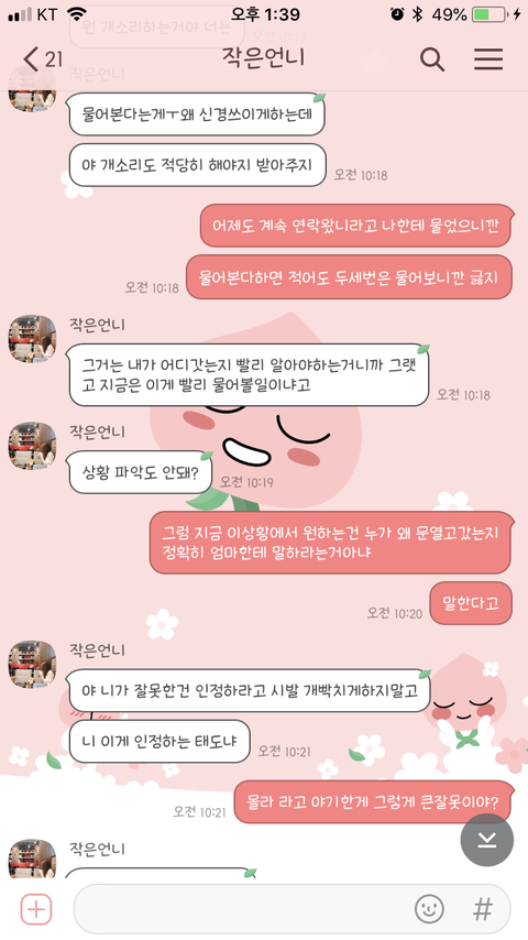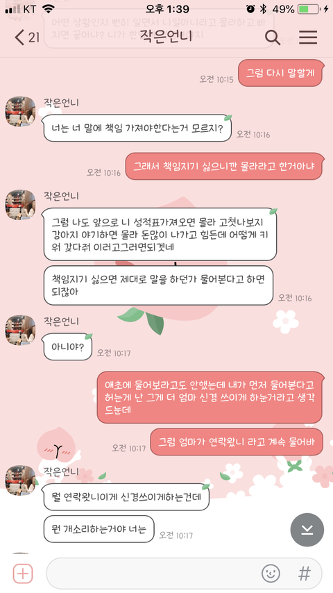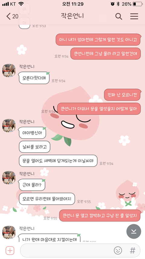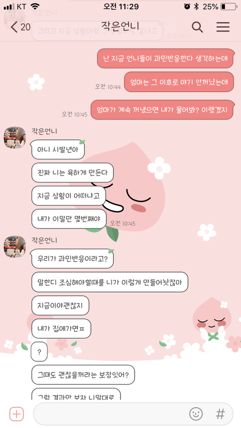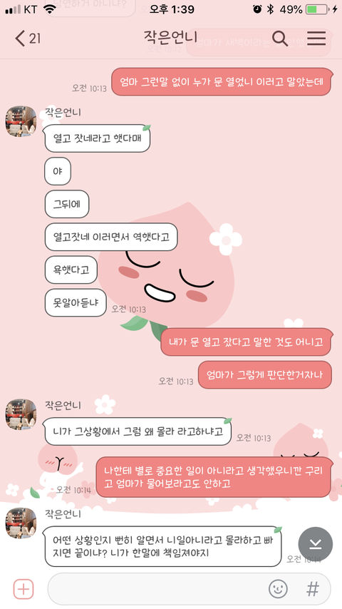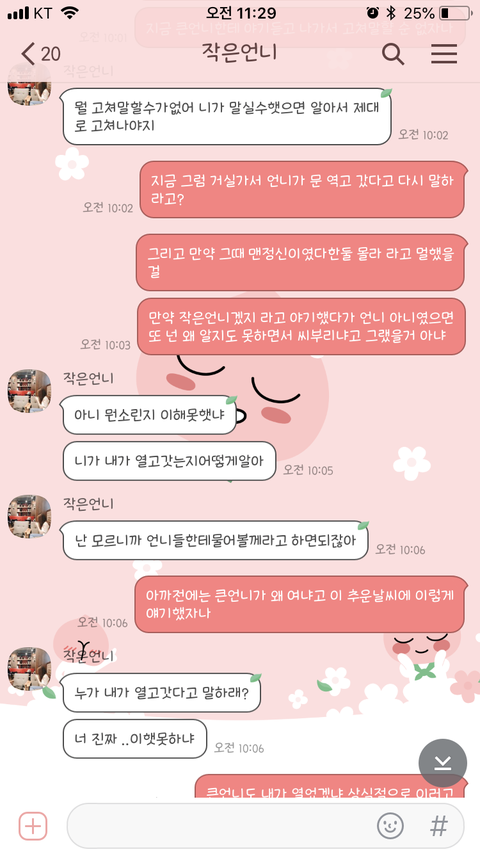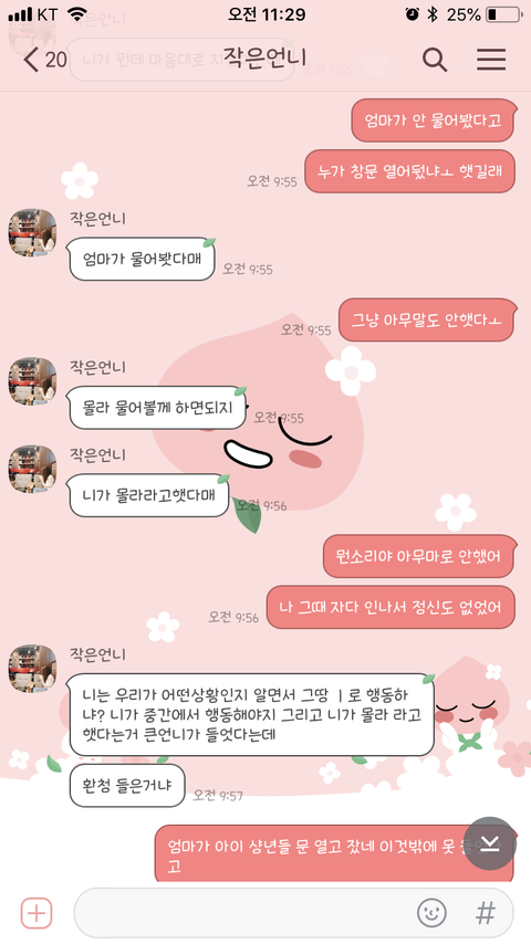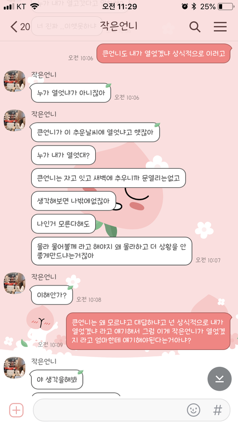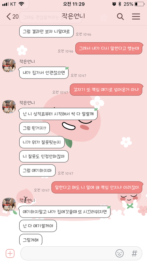 어제 엄마가 명절이여서 쉬는데 동생이 집안을 완전 난장판으로 만들어서 엄마가 빡쳐서 애를 정말 죽일듯이 패는거야 동생은 너무 울어서 바들바들떨고있고 그래서 언니들이 급하게 말리고 이럴거면 그냥 동생을 고아원에 보내라해서 언니들이랑 엄마랑 싸웠어 (동생문제 그리고 연락문제 복합적) 나는 딱히 신경안쓰고(원래 눈앞에서 가족이 죽는다해도 별 감정없을정도로 사람한테 정이 없어) 근데 엄마가 너네는 동생안보고 글쓴이가 다 보고있는데 왜 그딴 말하냐고 욕을 하는거야 그러면서 나랑 비교하니깐 나한테 감정이 어제부터 쌓여있었나봐 근데 오늘아침에 정말 별 말도 안되는걸로 싸워서ㅋㅋ 어이가 없어 오늘아침에 방에 창문이 열려있길래 누가 열었니 이렇게 물어서 내가 몰라 라고 말을 했데 그래서 엄마가 욕하면서 문 열고잤네 이러고 말았거든(아직도 언니들이랑 엄마랑 냉전) 근데 작은언니는 아침일찍 일하러가고 큰언니는 누워있었거든 근데 큰언니가 왜 몰라라고 얘기했냐고 언니한테 물어볼게 이렇게 얘기해야지 이러면서 욕하는거야 그래서 알겠어 이러고 말았는데 큰언니가 작은언니랑 이걸로 내 뒷담을 까다가 작은언니가 빡쳐서 나한테 연락이 왔는데(전에도 여러번 내 뒷담 깜 지들끼리) 이렇게 된거야.. 내가 잘못한거라 생각해? 솔직히 내상황에선 언니들이 동생을 볼 수 있는데 안 본거랑 그런것들이 다 너무 빡치고 분해서 나도 감정이 격해지긴 했는데.. 난 내가 잘모산 건지도 모르겠고 이게 그렇게 큰일인지도 모르겠어 그리고 언니가 내 성적표 위조에 대해 말한다면 그냥 죄송하다 하고 입 닫는게 나을까 아니면 언니들 대학교 안다니고 몰래 자취하고 옛날에 성적표 위조한거 다 말할까ㅠ