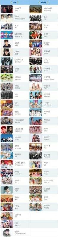 여돌: 아이들, 씨엘씨, 공소, 구구단, 나뮤, 드캐, 레벨, 모랜, 에플, 에핑, 여친, 우소, 위키, 트와, 프나, 플틴