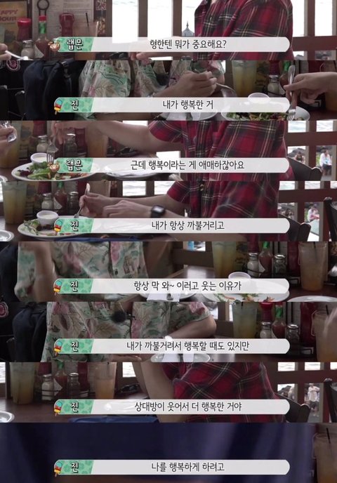 그런데 많은 사람들이 밝은 모습만 보고 단지 진을 활발하고 재밌다고만 알고있더라. 진은 생각깊고 항상 상대방을 먼저 배려하는 든든한 맏형이기도 해!