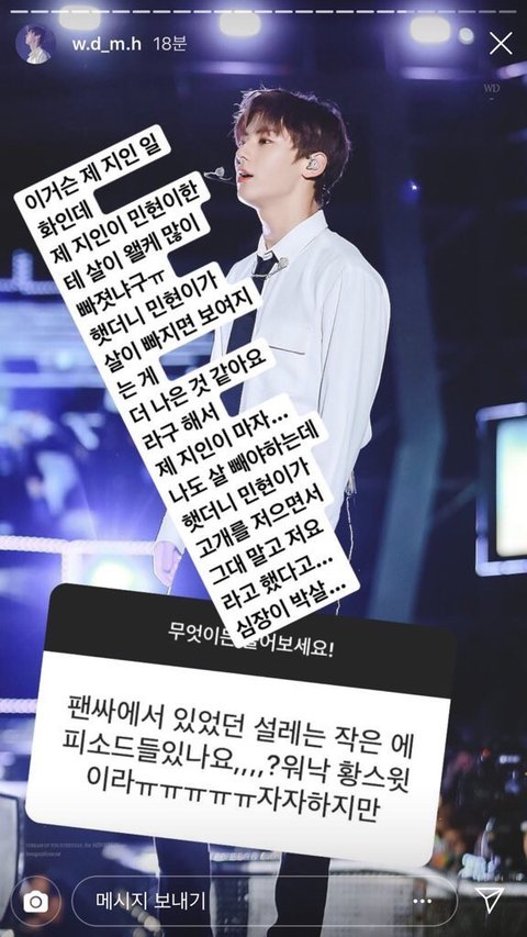민현이한테 살이 왤케 많이 빠졌냐구ㅠ했더니 민현이가 살이 빠지면 보여지는 게 더 나은 것 같아요 라구 해서 마자.. 나도 살빼야하는데 했더니 민현이가 고개를 저으면서 "그대 말고 저요" 라고... 심장이 박살...