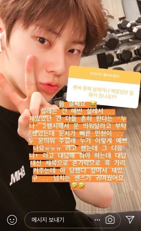 다들 흔히 한다는 '누나' 2행시해서 운 띄워달라고 부탁했었는데 눈치가 빠른 민현이 .. 누 운띄워 주길래 누가 이렇게 예쁘나요ㅠㅠㅠ 라고 했는데 그 다음 나! 라고 대답해 줘야 하는데 대답 대신 제쪽으로 손가락으로 콕 가리켜주는데 아 당했다 싶어서 재밌구.. 넘치는 센스가 귀여웠어요