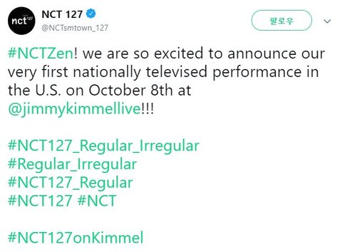0월 8일 지미키멜쇼 에서 신곡 무대를 최초 공개한다는 NCT127갑작스러운 소식에 팬들도 어리둥절중...어쨌든 미국 인기 토크쇼 출연이라니 정말 잘됐네요!!!미국인들에게 NCT127의 멋진 칼군무 무대 제대로 보여주고 오기를~~~