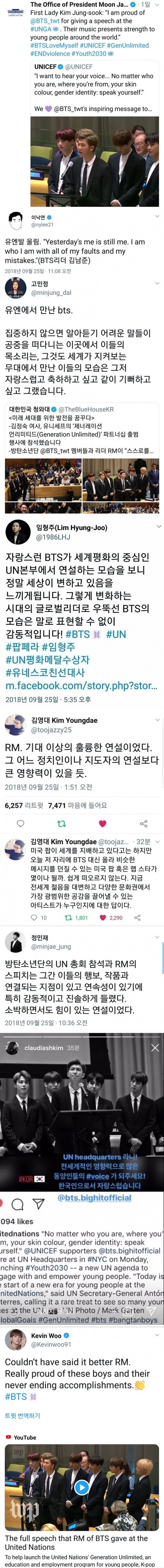 대한 인식과 동양인에 대한 정형화된 이미지를 어떻게 변화시켰는지, 또 이 시대의 젊은이들이 가장 필요로 한 말을 방탄이 어떻게 대변했는지 등 모두 유엔 연설이 가진 의미와 메시지를 공유하며 기뻐해하더라.