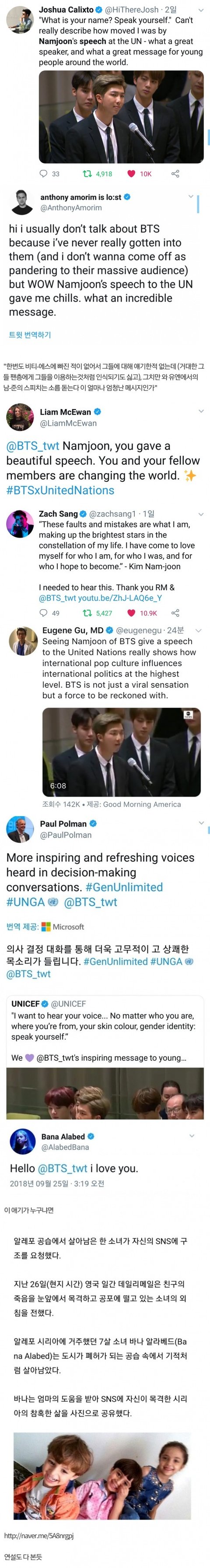이게 지금까지 내가 포착한 방탄의 UN연설이 몰고온 선한 파동, 그 기류의 일부야.