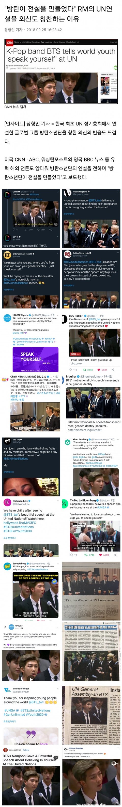 더 나아가 해외 외신들까지 입을 모아 방탄의 연설을 극찬했어.
