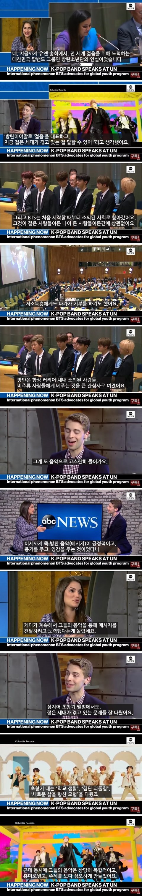 이렇듯 외신들은 입을 모아 극찬을 했고, 미국의 공중파 abc뉴스는 RM의 유엔 연설 부분을 생중계 해줌과 동시에 케이팝 저널리스트와 방탄 연설의 의미를 얘기하는 극히 이례적인 장면까지 연출했어.