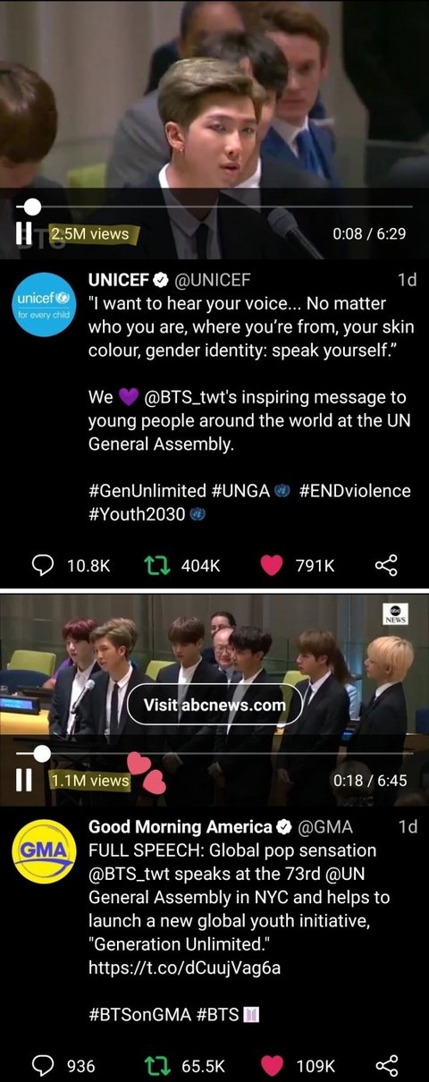 방탄의 유엔 연설은 여러 소셜 플랫폼을 타고 각각 몇백만에 달하는 조회수를 냈고,