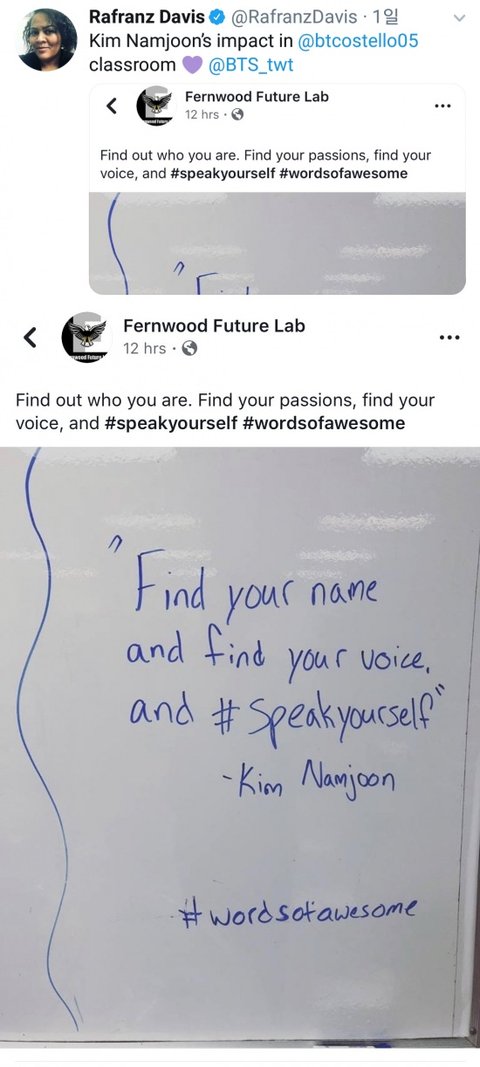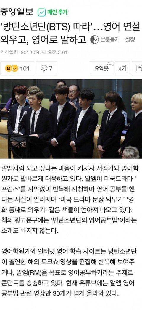 RM의 연설문을 학교를 비롯한 학원가, 서점가에서 학생들의 영어 공부로 활용하는 사례가 늘어나는 등 한국을 넘어 전세계적인 파동을 일으켰어.