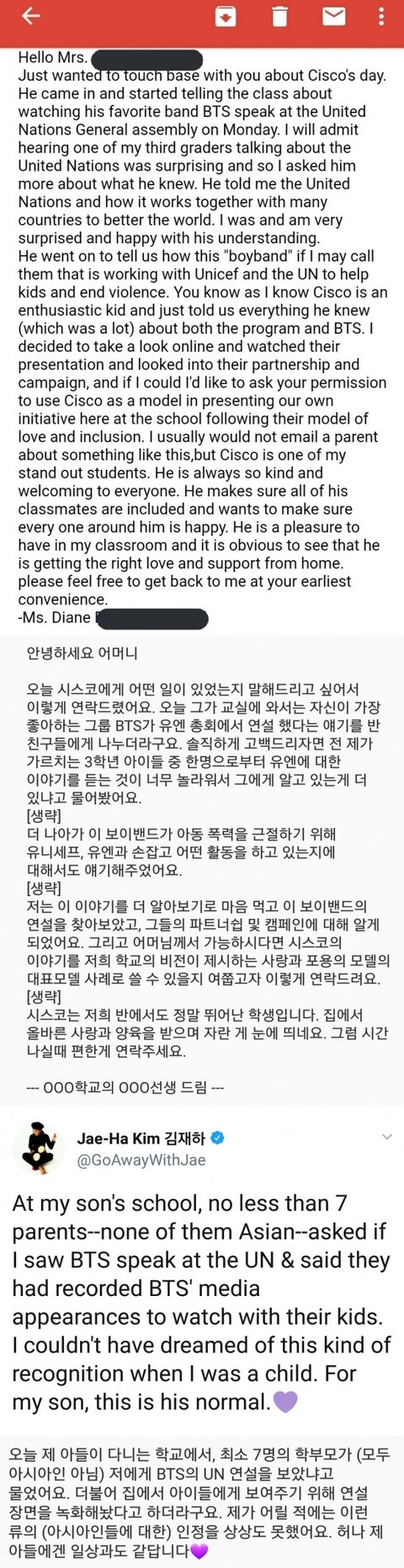 - 한 미국인 학부모가 초등학교 3학년인 아들의 담임선생으로부터 받았다는 이메일.
