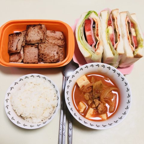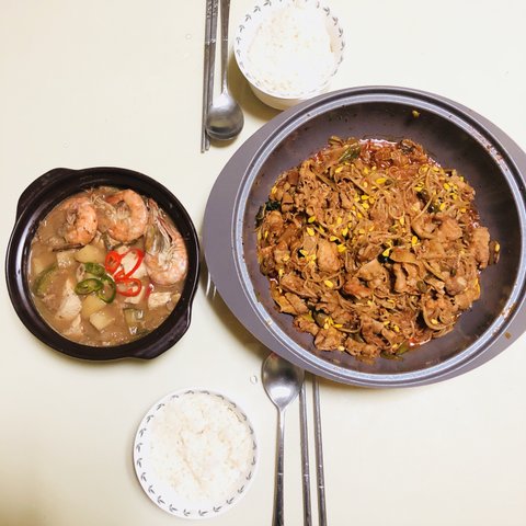 자취밥상을 원하는거 같아 스팸이랑 목살김치찌개예요 ㅋㅋㅋㅋㅋㅋㅋㅋ 양은 다들 눈치채셨듯이..뭐 많이 먹기 때문에