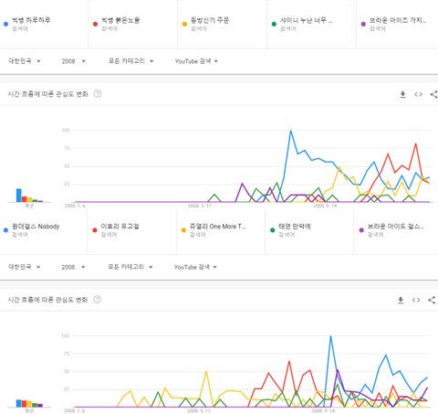 여자가수 : 원더걸스 노바디, 이효리 유고걸, 쥬얼리 원몰타임, 태연 만약에, 브아걸 어쩌다 순
