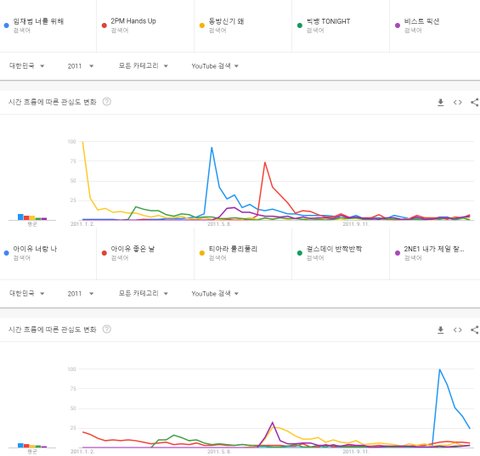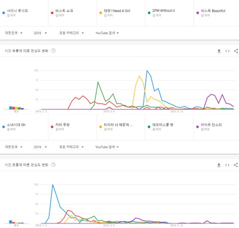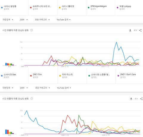 여자가수 : 소녀시대 Gee, 투애니원 파이어, 카라 미스터, 소녀시대 소원을 말해봐, 투애니원 아이돈케어 순