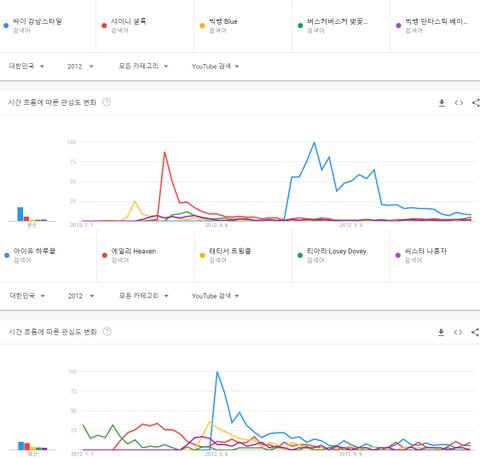 남자가수 : 싸이 강남스타일, 샤이니 셜록, 빅뱅 블루, 버스커 버스커 벚꽃엔딩, 빅뱅 판타스틱 베이비 순