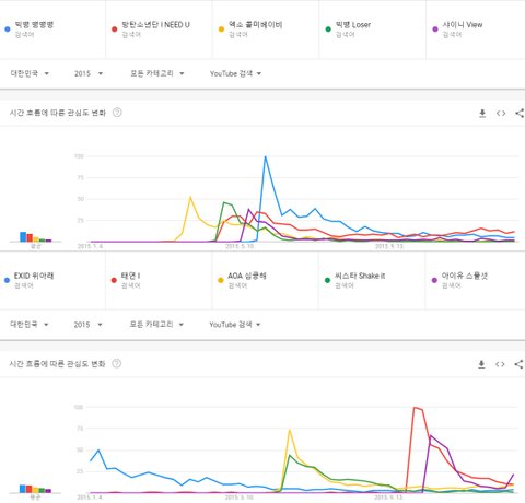 남자가수 : 빅뱅 뱅뱅뱅, 방탄소년단 아이 니드 유, 엑소 콜미베이비, 빅뱅 루저, 샤이니 뷰 순