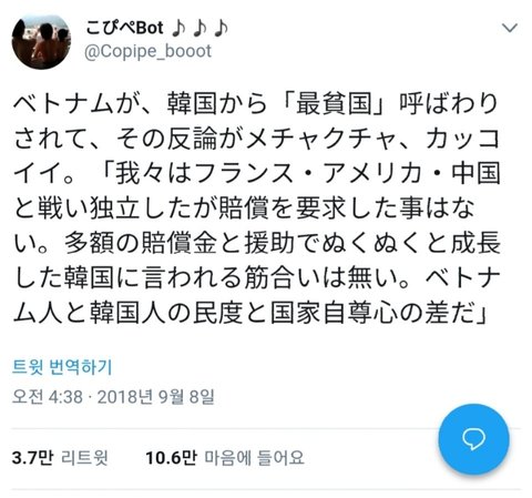 번역 : 베트남이 한국에게 '최빈국' 취급을 당하고, 그 반론이 엄청나게 멋있어. 「 우리들은 프랑스, 미국, 중국하고 싸워 독립했지만 배상을 요구했던 적은 없다. 거액의 배상금과 원조로 뻔뻔스럽게 성장한 한국에게 들을 처지는 아니다. 베트남인과 한국인의 민도, 국가 자존심의 차이다. 」