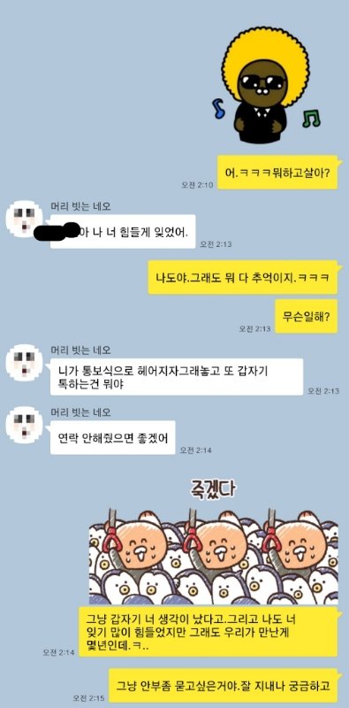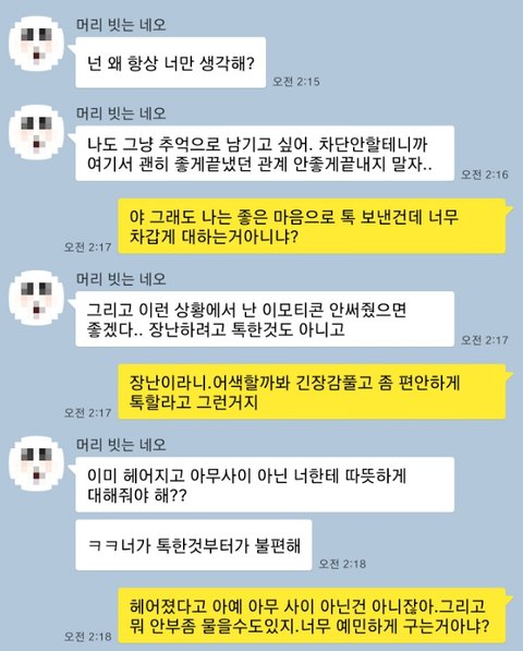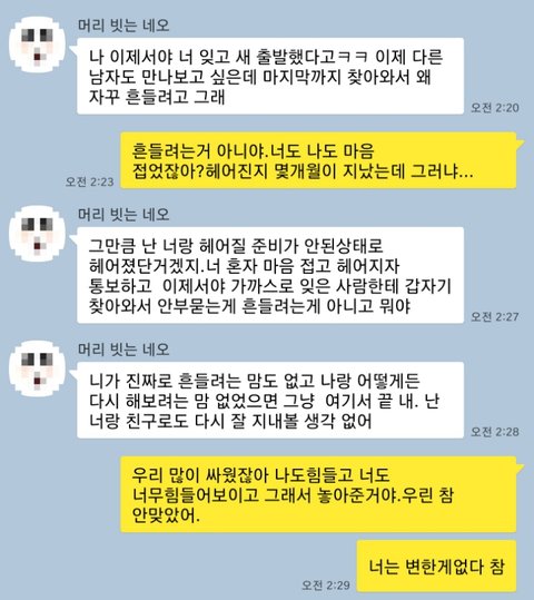 저는 20대 중반 남자입니다. 여자친구와 결혼 생각으로 2년가량 만났구요.동갑이고 대학에서 만났습니다.현재 헤어진지 4,5개월정도 되었습니다.헤어진이유는 잘 안맞는다고 생각하면서도 사랑한다는 이유만으로 사귀었지만,가치관도 생각도 너무 달라서 사소한걸로도 싸움이 잦아져 점점 서로지쳐서 헤어졌는데요.이별통보는 제가 했어요. 상대도 납득해주고 안싸우고 좋게 끝냈어요.그동안 연락 한번 안하다가 갑자기 떠오른것도있고 잘지내나해서 안부물을겸 선톡하나 보냈습니다. 차단해놨을수도있고 무시할수도 있다는생각에 깊게 생각안하고 가벼운마음으로 보냈어요.그래도 저도 많이 사랑했던 여자고 오래 교제한만큼 잊기힘들고 많이 울기도하고 저도 겨우잊혀져서 맘편히 지낸다해도 그동안의 정도있고 그리운마음도있고해서 드문드문 생각이났습니다.갤러리 정리 하다가 안지운 사진이 보여서 추억도 떠오르고 문득 전여친이 생각이 나 잘지내나 싶어 톡했던거구요.헤어지고나서는 미련없이 끝내자며 연락하지말자는 말을 서로했는데 오랜만에 톡보내면 반겨줄까 싶어서 보냈습니다.미련은 없고 그냥 안부만 물을려했던거에요.겨우 절 잊었다는말에 솔직히 미안하면서도 기쁜마음도있었구요...그런데 제가 어색할까봐 편하게 톡하고싶어서 이모티콘을 썼는데 그 시점부터 싸움이난거같아요...저는 아무래도 헤어진사이니까 부담스러울까봐 긴장감도 풀겸 살짝 장난친건데 뭐가 그리 기분나빳던건지 너무 아니꼽게 보네요.흔들려는 마음은 무슨소린지 참 헤어진지 그정도지났는데 흔들릴수있어요?안부묻는정도로 흔들리기 쉬운건가요...?그리고 저는 그냥 친구같은마음으로 어떻게 살고있나 궁금해서 대화한번하고싶어 톡한건데 너무 예민하게 구는거 아닐까싶어요. 그뒤에 절 비꼬듯이 말하자 너무화가나서 제가 좀 흥분해버린점도있지만 제마음은 싸울려고톡한것도아니고 그리운마음이였거든요...전남친한테서 선톡하나정도 온다고 이런반응이 나올수있는건가요;;진짜 저도 기분나빠서 올려봅니다.제가 마지막에 말을 험하게하긴했지만 나름 좋게끝냈으니 안부정도는 물을수있다 생각했고요,단지 궁금해서였어요.전남친한테서 이런톡오면 기분 많이 나쁜걸까요?그냥 좋게좋게 아 잘지낸다 넌 잘지내냐?이런식으로라도 답하면되는걸 굳이 사람 맘상하게 만드네요.헤어진사이면 드문드문 생각이날수도있는거 아닙니까?안부정도도 못묻는건가요.그리고 헤어진지도 꽤 되었는데 흔들린다는소리가 이해안갑니다.애초에 매달리고 붙잡은것도아니고.싸우는게 너무 지쳐서 싸우다 안좋게 헤어지는것보단 낫겠다 싶어 이별을 통보한 거구요.힘들게 잊었다하는데 결국은 잊은거아닙니까?저도 사랑하는마음은있었지만 연애에 대해 많이 지쳐있던 상태라 그런선택을 했습니다.그리고 서로 다 잊기로한거고 몇개월만에 톡하는건데 반가워해주기는커녕 사람을 참 개취급도 안해주네요.