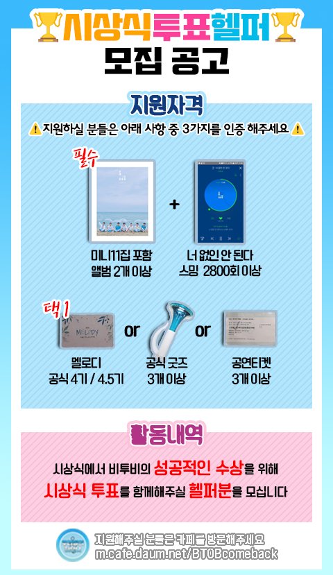 앞두고 있는 시상식 투표에서 좋은 성과를 얻기 위해 투표총공 역시 맡아서 하고 있는 중입니다.따라서 총공에 필요한 구글 아이디와 카카오 아이디 기부를 받고 있고 투표를 도와줄 헬퍼분들을 모집하고 있습니다.
