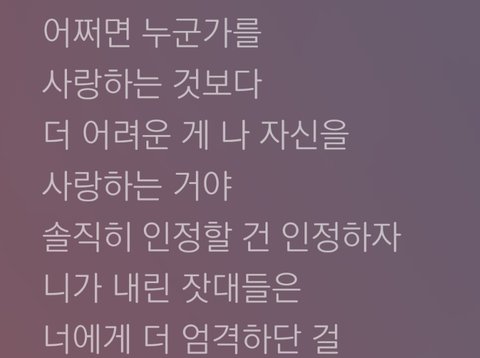특히 니가 내린 잣대들은 너에게 더 엄격하다는걸 이 가사 정말 나 자신이 싫어서 그냥 죽어버리길 기도했던 내가 생각나고 그때로부터 몇년이 지난 지금까지 그때의 기억 때문에 나 자신을 사랑하지 못하는 내 모습을 되돌아볼 수 있게 해주는거같아